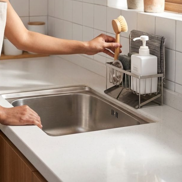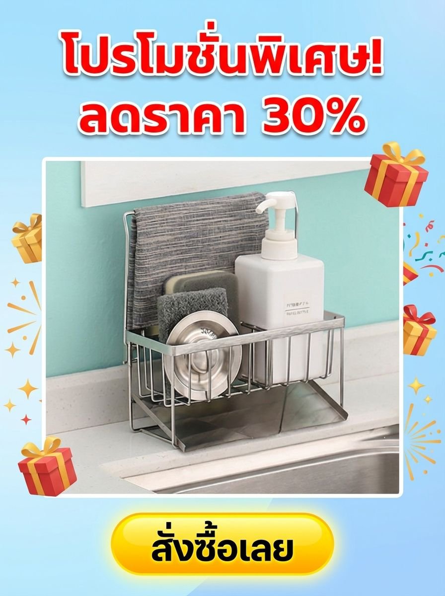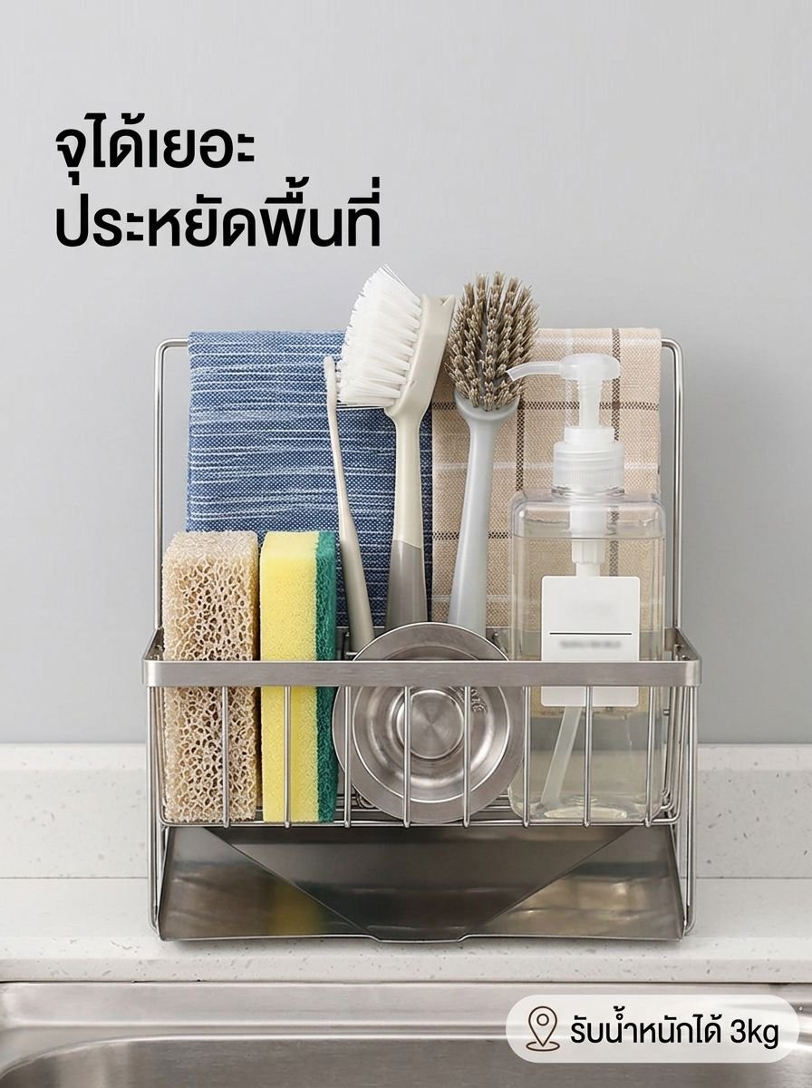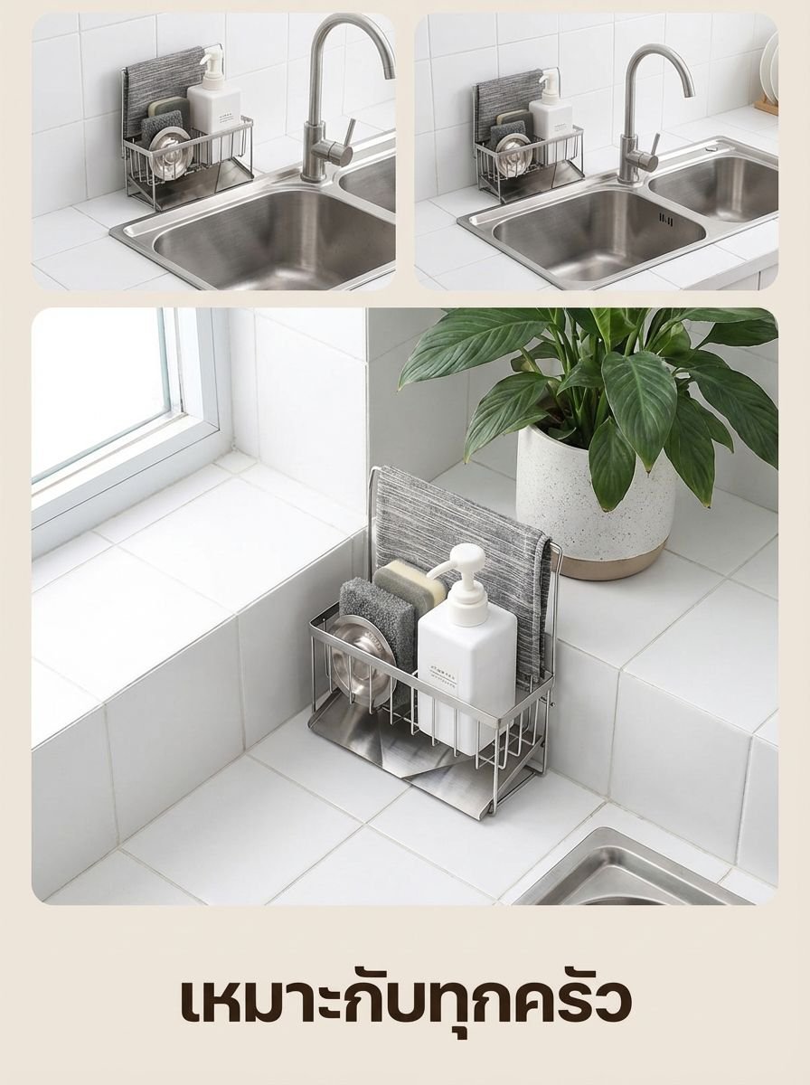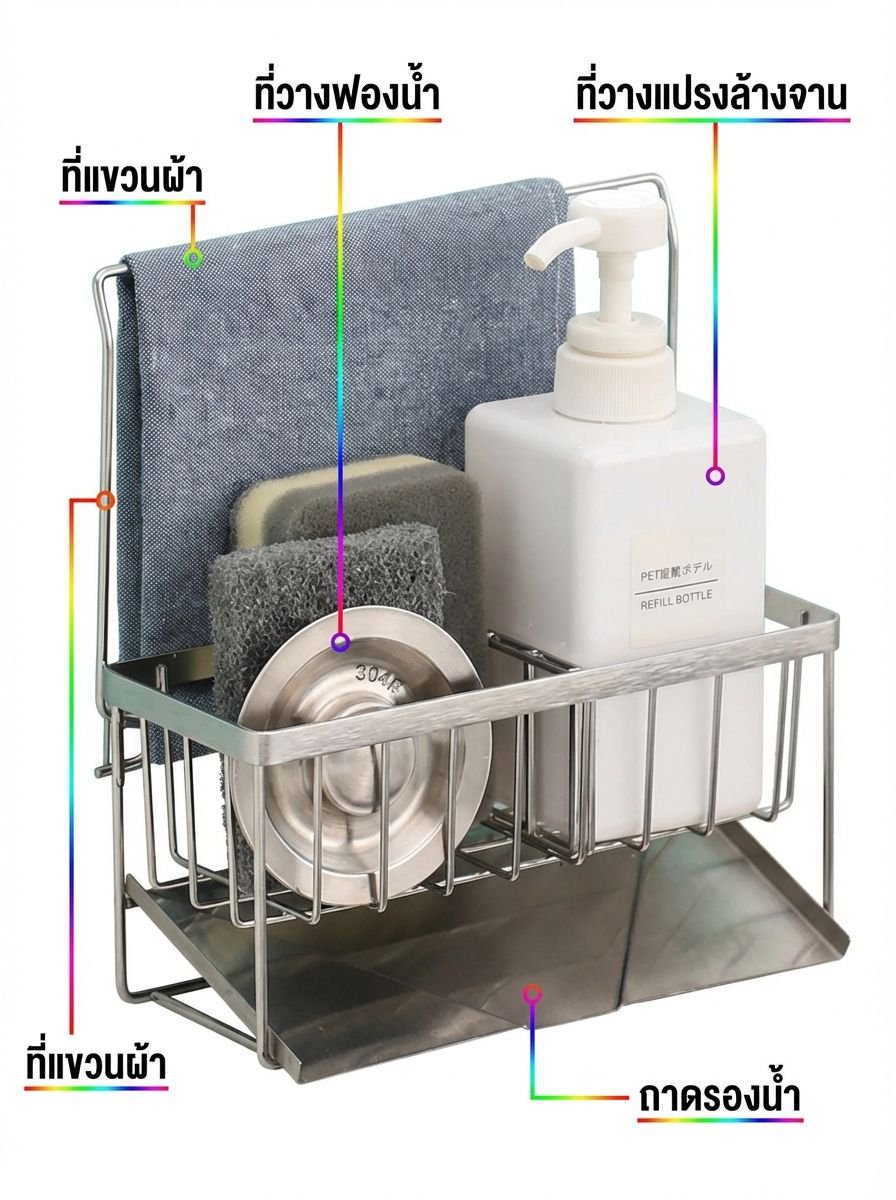 ● ชั้นวางฟองน้ำและผ้าในครัว ออกแบบสำหรับติดตั้งที่อ่างล้างจาน ช่วยจัดระเบียบและประหยัดพื้นที่ใช้สอยได้อย่างมีประสิทธิภาพ